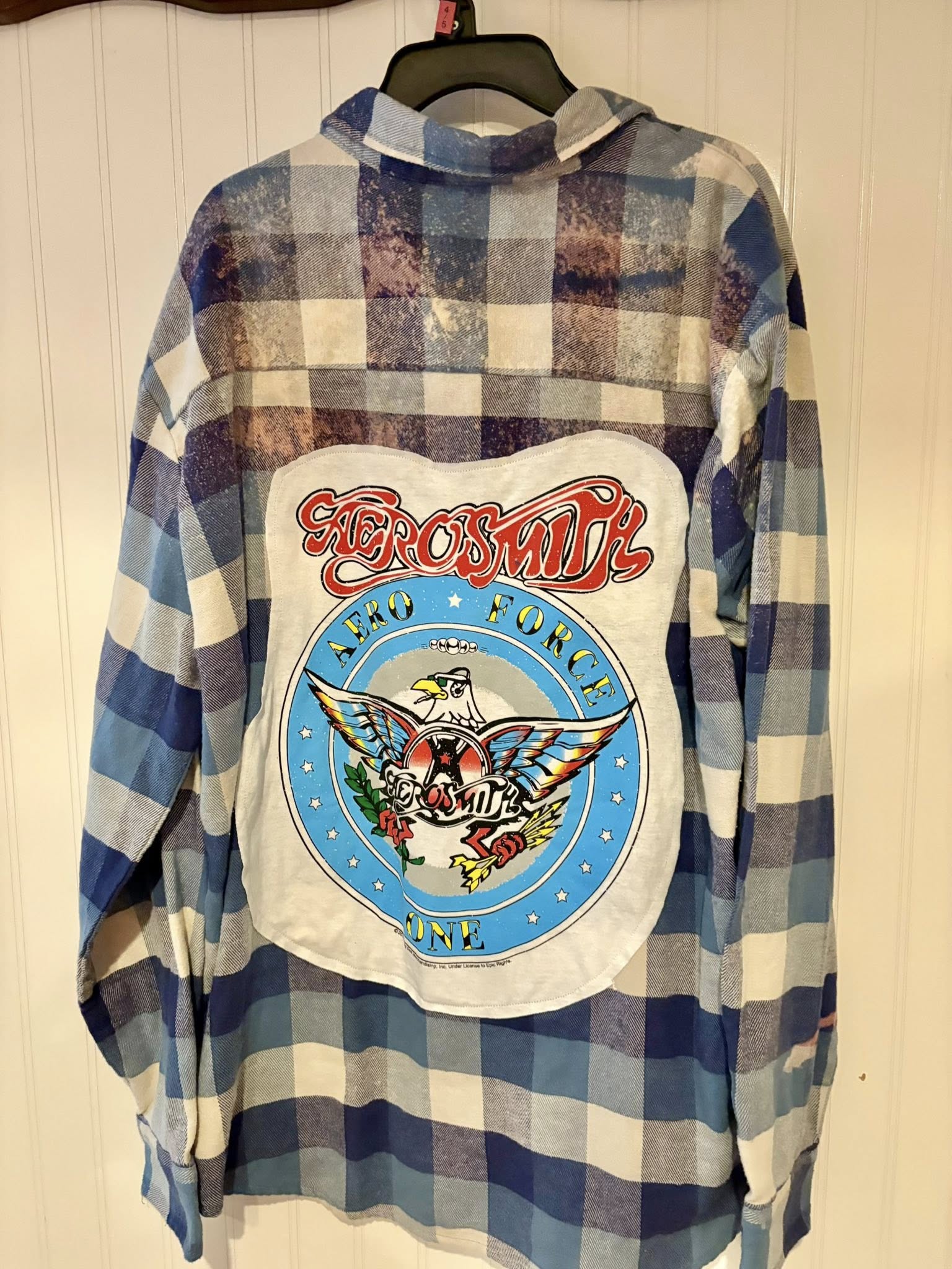 Rock out in this one-of-a-kind size large flannel that's perfect for any fan! Bleached to perfection with an iconic Aerosmith graphic on the back, this unisex fit piece brings vintage vibes and serious band cred to your wardrobe. Whether you're channeling '70s rock energy or just want to make a statement, this unique flannel is ready to turn heads. Grab it while it lasts—there's only one!