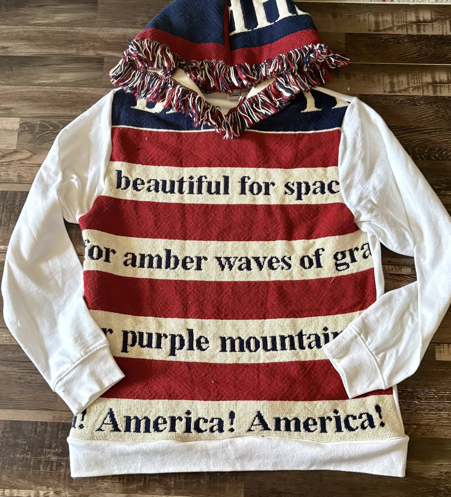 Celebrate cozy uniqueness with this American flag hoodie, crafted from an upcycled tapestry blanket. Designed in a unisex medium size, the front and hood showcase the original tapestry patterns, making each hoodie truly one of a kind. Perfect for adding a playful, eco-friendly twist to your wardrobe while staying comfy and warm.