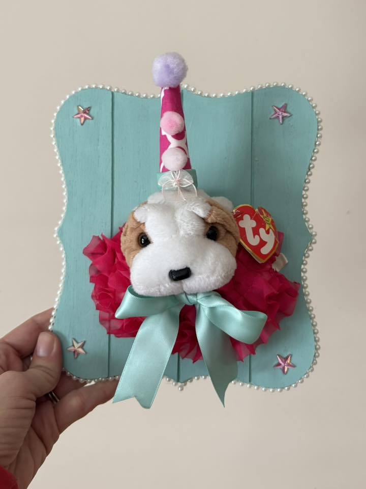This one-of-a-kind taxidermy piece features a charming beanie baby bulldog mounted on a soft light aqua backdrop, dressed to celebrate in a festive party hat and delicate ruffles. A quirky conversation starter that blends nostalgia with whimsical décor, this cruelty-free creation brings personality and charm to any room. Perfect for collectors, dog lovers, and anyone who appreciates unconventional art with a playful spirit.