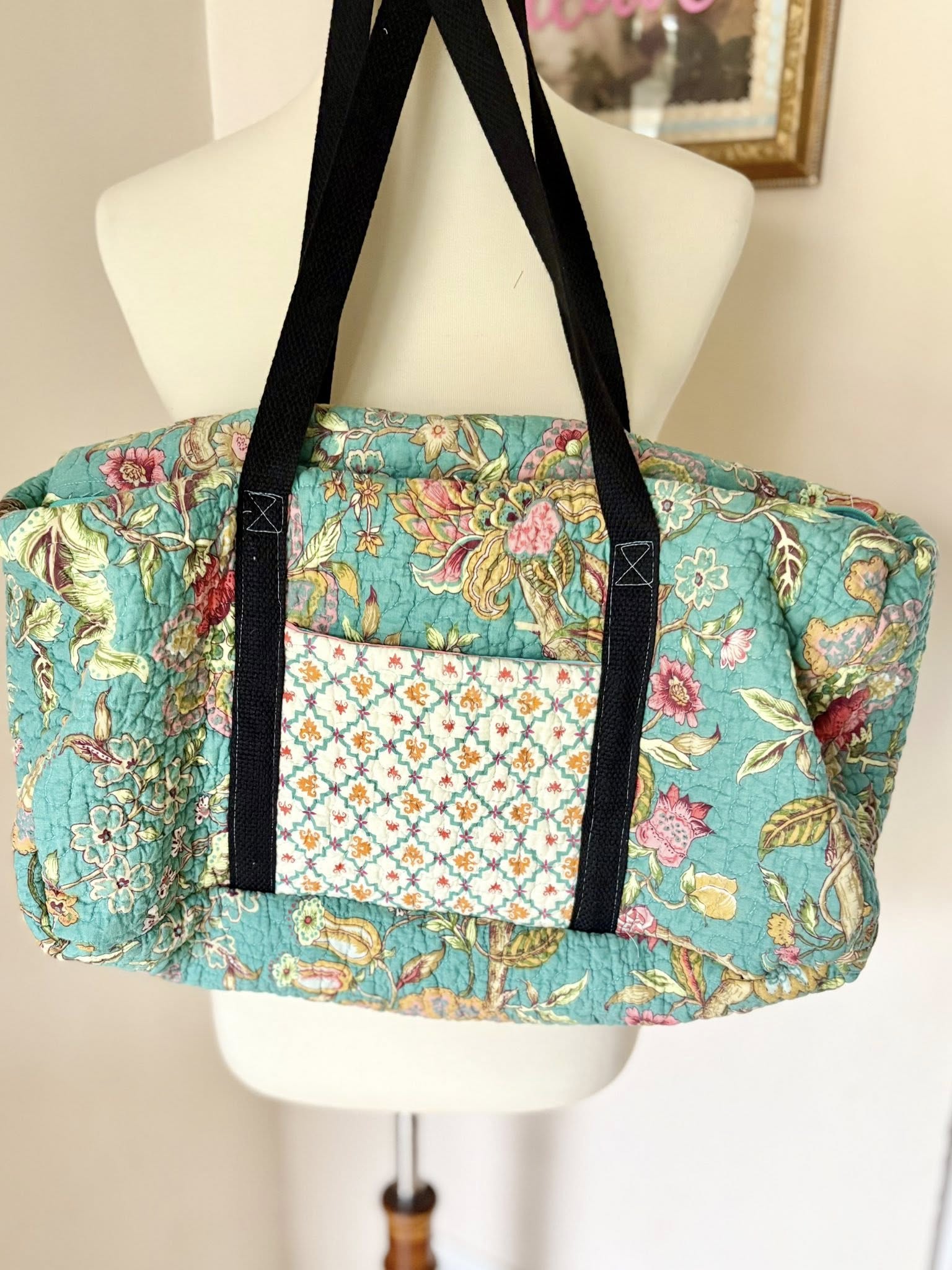 Carry your essentials in style with this one-of-a-kind duffle bag, lovingly upcycled from a vintage quilt! Featuring a cheerful aqua color print, this bag is fully lined for durability and packed with practical features—inner pockets keep your smaller items organized, while an outer pocket offers quick access to must-haves. Perfect for weekend getaways, dance class, or everyday adventures. Each bag is unique, so you're getting a truly special piece that's kind to the planet and fabulous to carry.