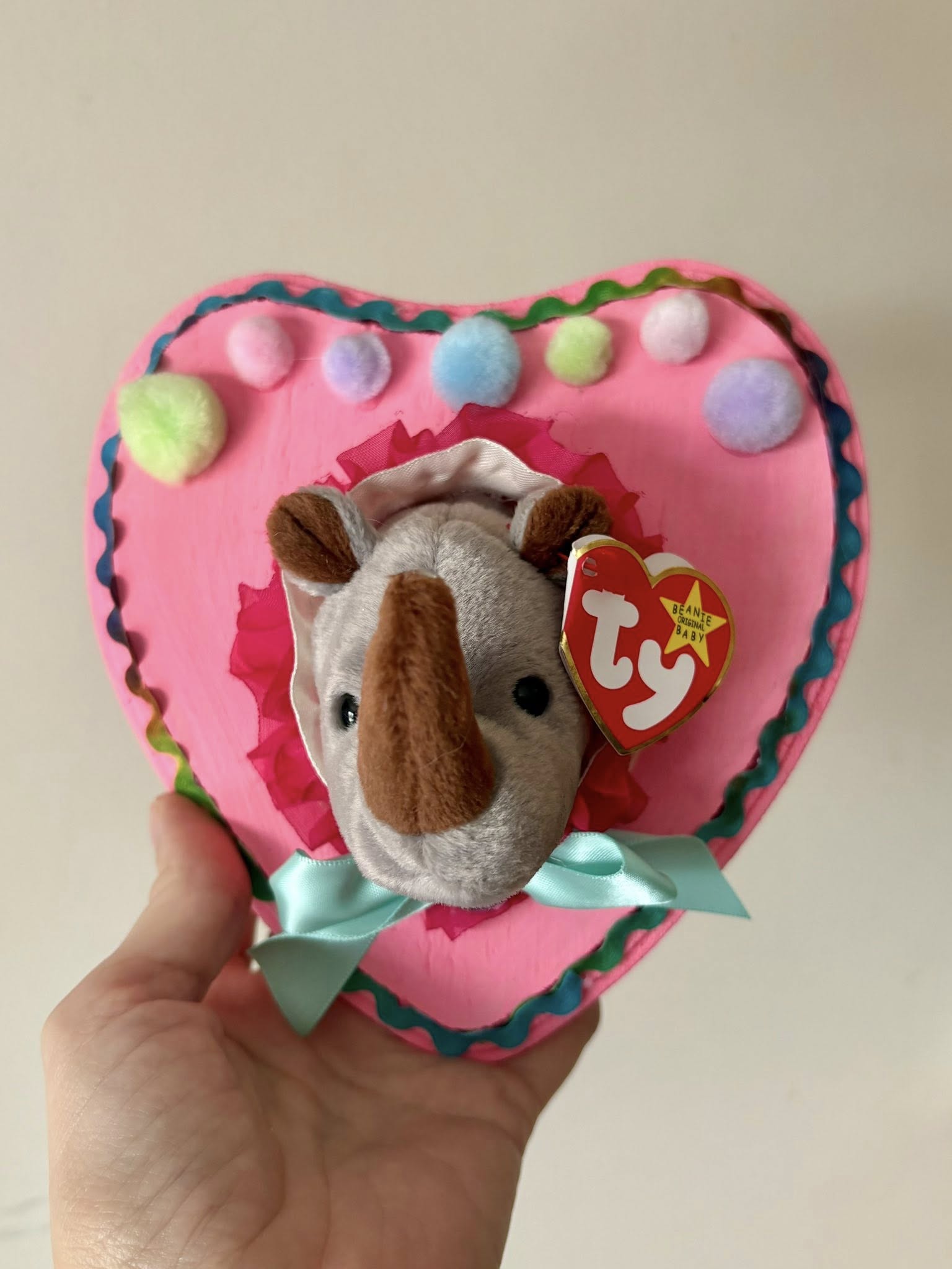Bring nostalgia and whimsy into your space with this one-of-a-kind cruelty-free taxidermy rhino. Inspired by beloved beanie babies, this charming creation features an adorably dressed rhino complete with ruffles and a delicate bow, mounted on a soft pink heart base accented with rainbow details. Perfect dopamine decor that celebrates your childhood collection while adding playful personality to any room. A unique conversation starter that blends vintage charm with modern artistry.