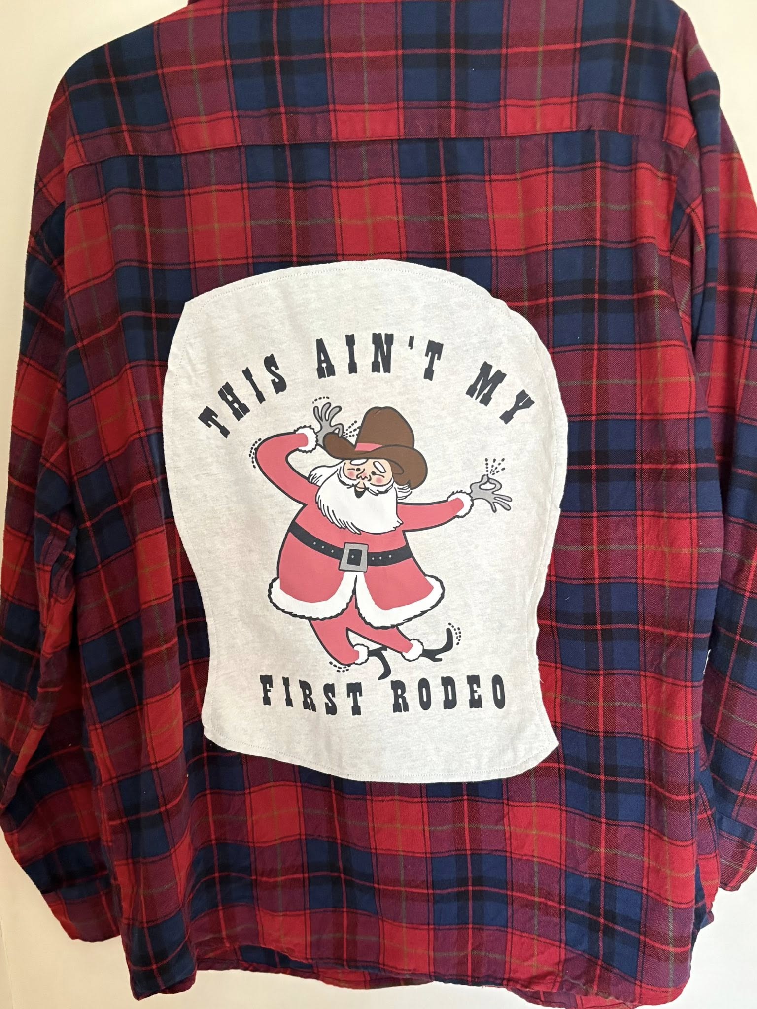 One-of-a-kind unisex flannel shirt in size large, featuring a bold back appliqué with a Santa cowboy graphic and the cheeky phrase "This Ain't My First Rodeo." Perfect for anyone who loves quirky holiday humor mixed with western flair. A standout piece that combines festive spirit with attitude—ideal for casual wear, themed parties, or anyone ready to make a statement this season.