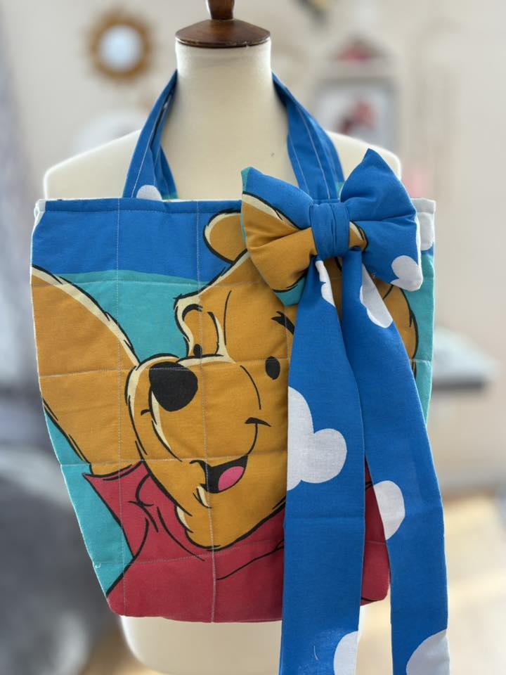 Carry a piece of nostalgia with this one-of-a-kind quilted tote, lovingly upcycled from a vintage Winnie the Pooh pillowcase. Featuring cheerful Pooh on one side and sweet Piglet on the other, this charming bag brings childhood magic to your everyday adventures. Fully lined and The removable bow adds a playful touch you can style however you like. Measuring 14" tall by 13" wide, it's the perfect size for books, groceries, or treasured finds. A delightful way to celebrate classic characters while embracing sustainable style.